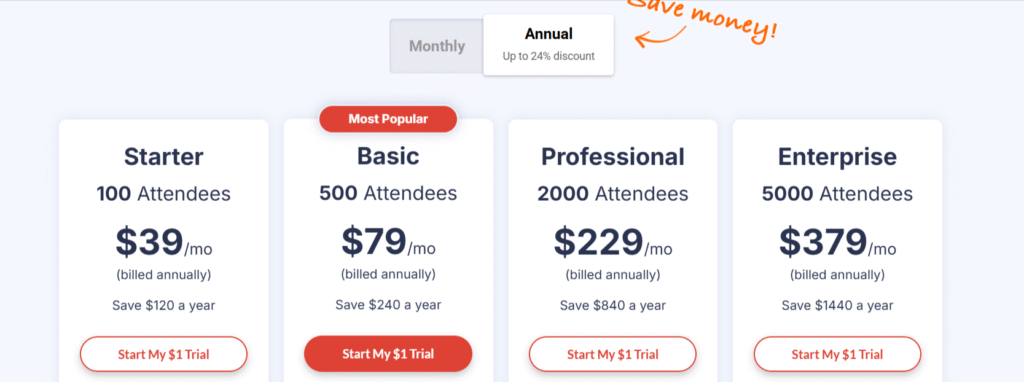 - Starter: Perfect for individuals or small businesses starting webinars, offering essential tools to host interactive sessions.